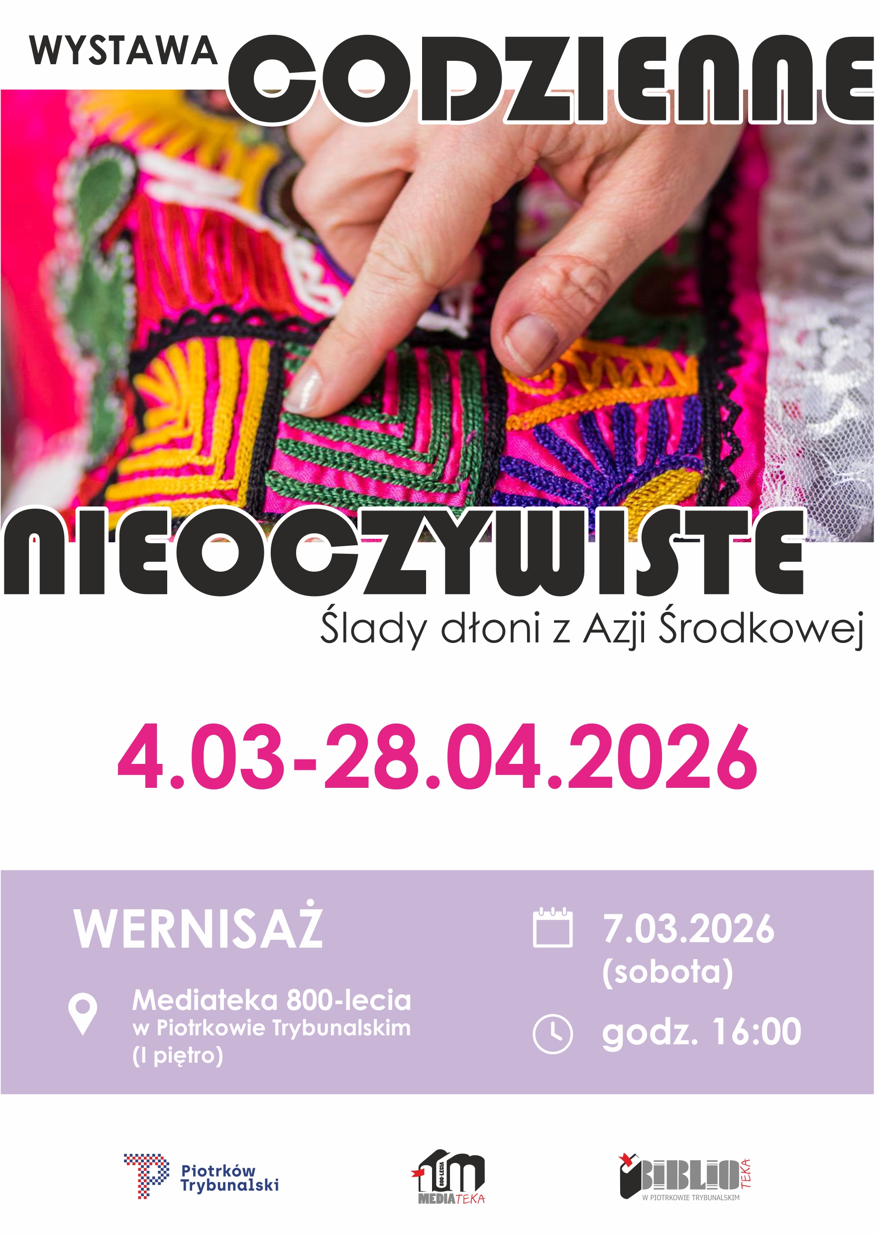 Na grafice znajduje się plakat zapowiadający wystawę „Codzienne nieoczywiste. Ślady dłoni z Azji Środkowej”. W centralnej części widoczna jest fotografia przedstawiająca fragment kolorowej tkaniny z bogatym haftem oraz dłoń wskazującą detale wzoru. Poniżej podano termin prezentacji wystawy: od 4 marca do 28 kwietnia 2026 roku. Na plakacie znajduje się również informacja o wernisażu, który odbędzie się 7 marca 2026 roku (sobota) o godzinie 16:00 w Mediatece 800-lecia w Piotrkowie Trybunalskim (I piętro). W dolnej części widoczne są logotypy instytucji współorganizujących wydarzenie.