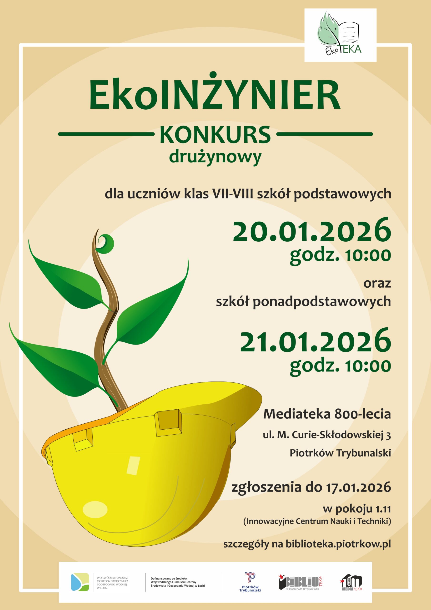 Serdecznie zapraszamy do udziału w drużynowym konkursie „EkoINŻYNIER”, przeznaczonym dla uczniów klas VII–VIII szkół podstawowych oraz szkół ponadpodstawowych. Konkurs dla szkół podstawowych odbędzie się 20 stycznia 2026 roku, a dla szkół ponadpodstawowych 21 stycznia 2026 roku w Mediatece 800-lecia. Na zgłoszenia czekamy do 17 stycznia 2026 roku. Regulamin konkursu wraz z kartą zgłoszenia dostępne poniżej.