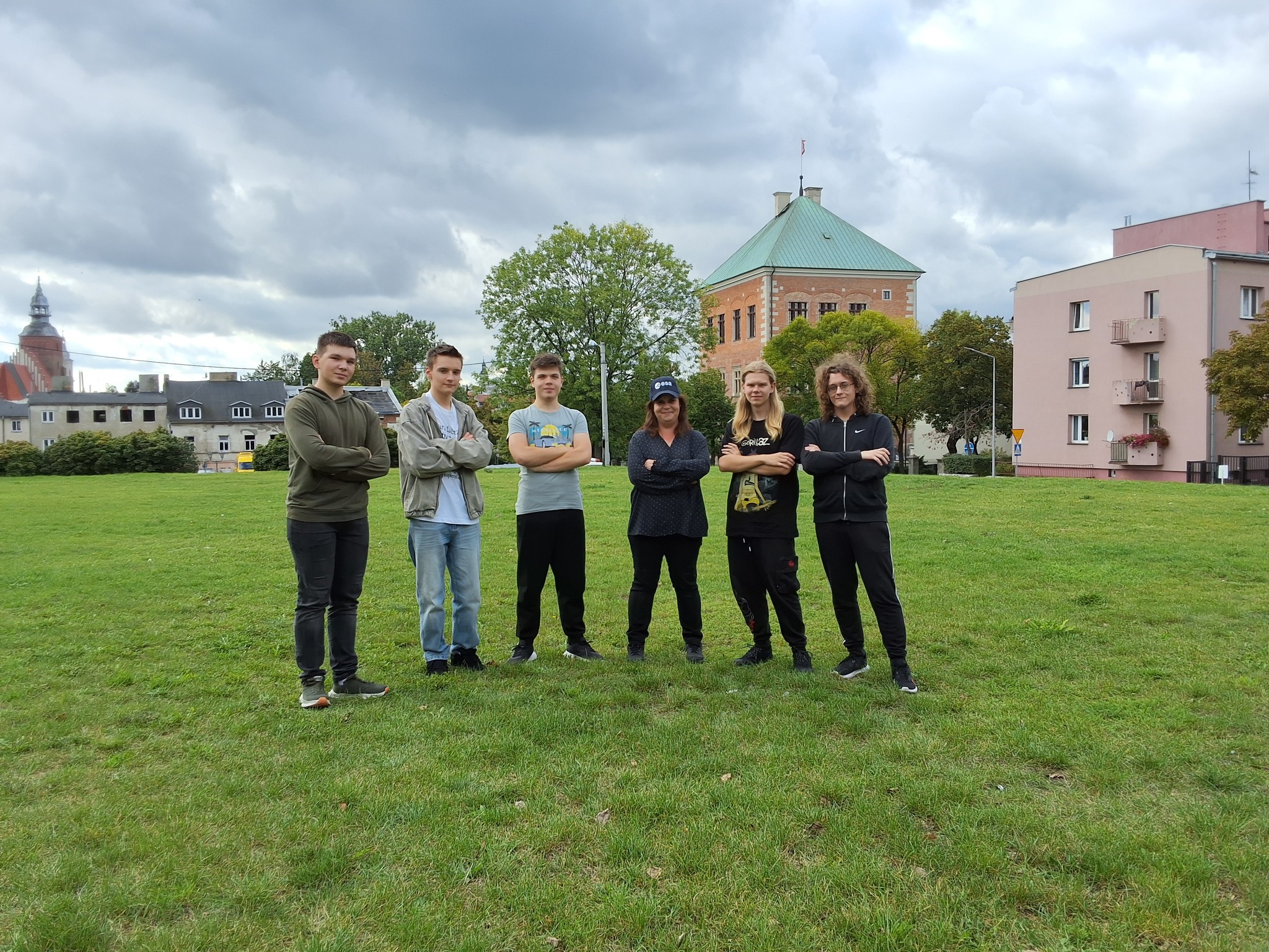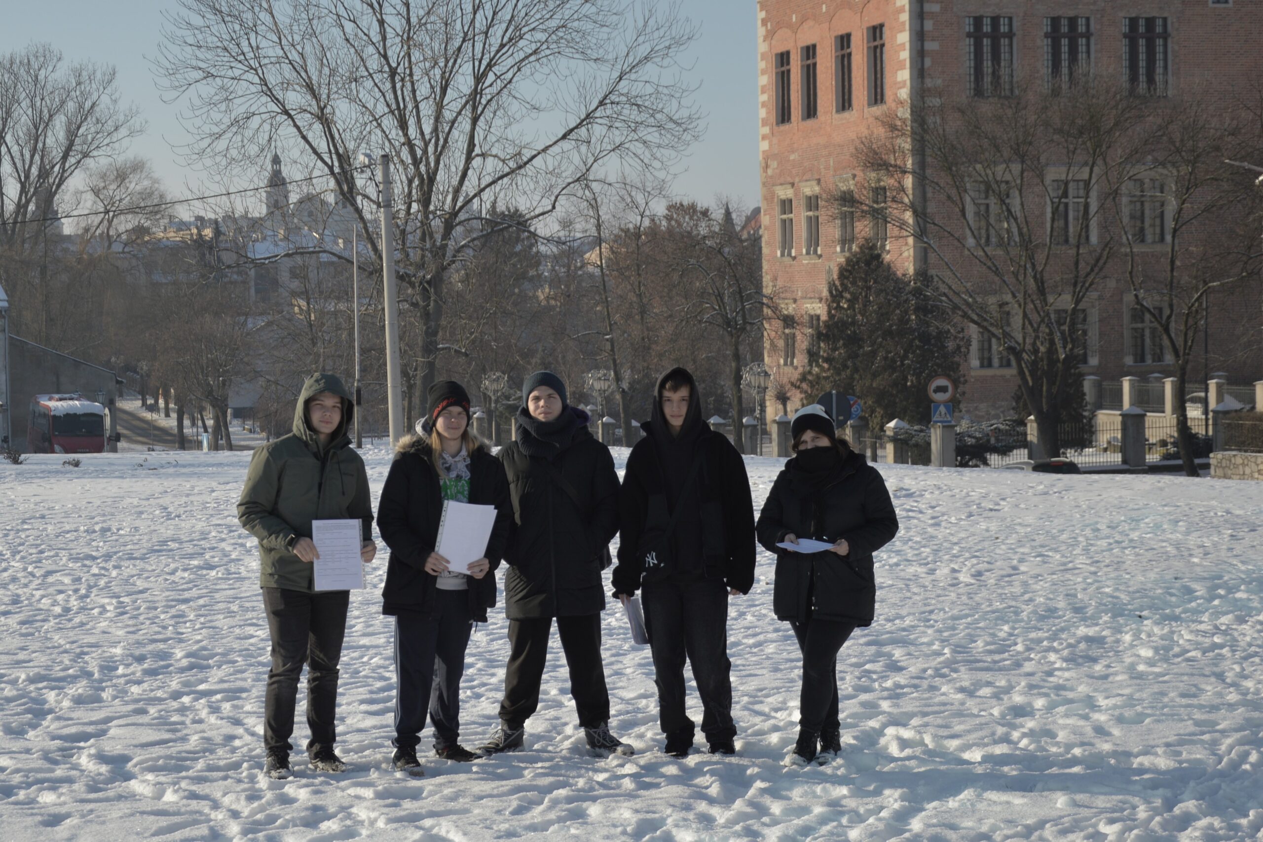 Grupa pięciu młodych osób stoi na ośnieżonym terenie w przestrzeni miejskiej. Ubrani w zimowe kurtki i czapki uczestnicy trzymają w dłoniach dokumenty. W tle widoczny jest budynek z cegły oraz drzewa bez liści. Zdjęcie przedstawia realizację działań terenowych w ramach projektu dotyczącego monitorowania jakości powietrza.