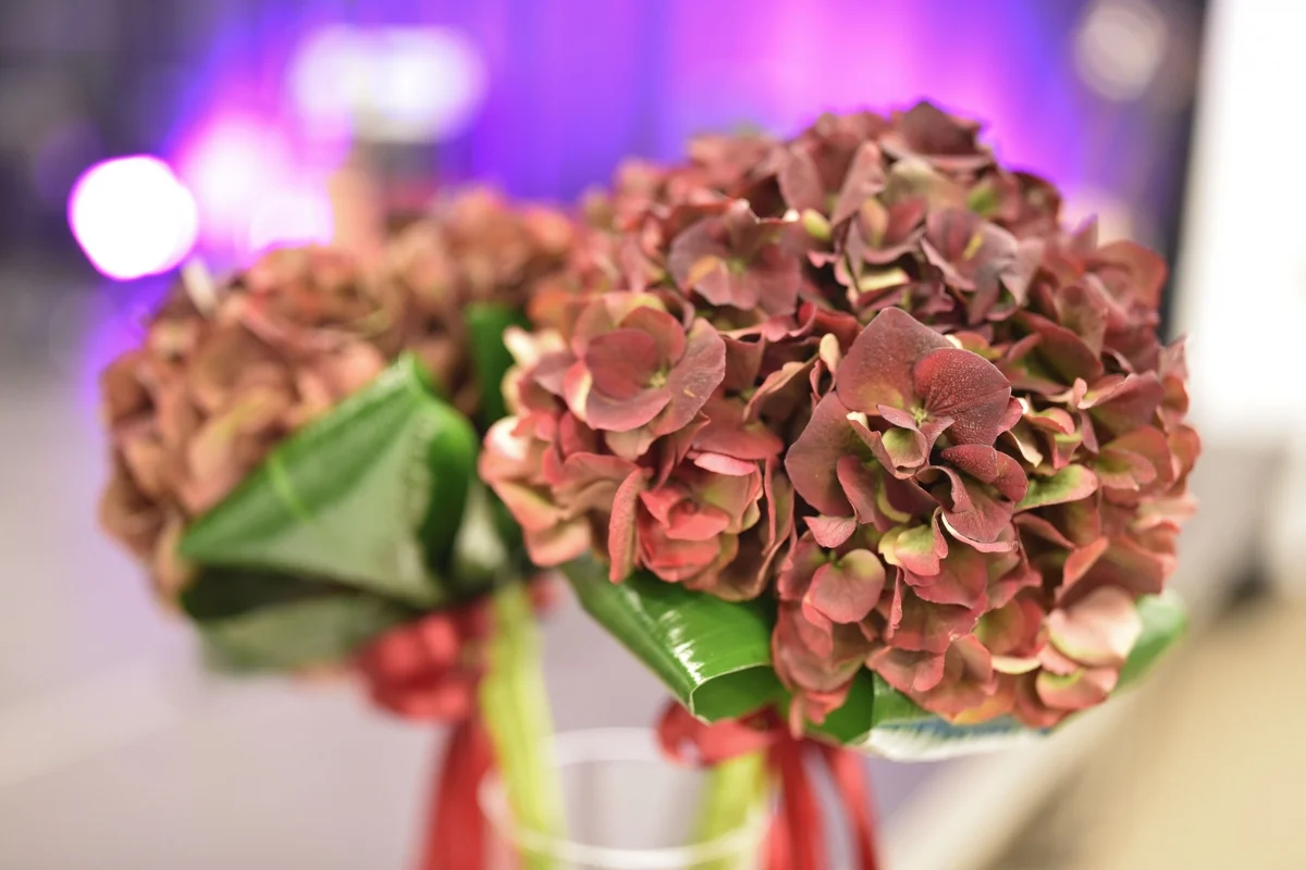 Na stole ustawione są dekoracyjne kompozycje z hortensji w odcieniach czerwieni i brązu. Kwiaty ułożone są w niewielkich bukietach ozdobionych zielonymi liśćmi i czerwonymi wstążkami, stanowiąc elegancki element dekoracyjny przygotowany na wydarzenie organizowane w Mediatece.