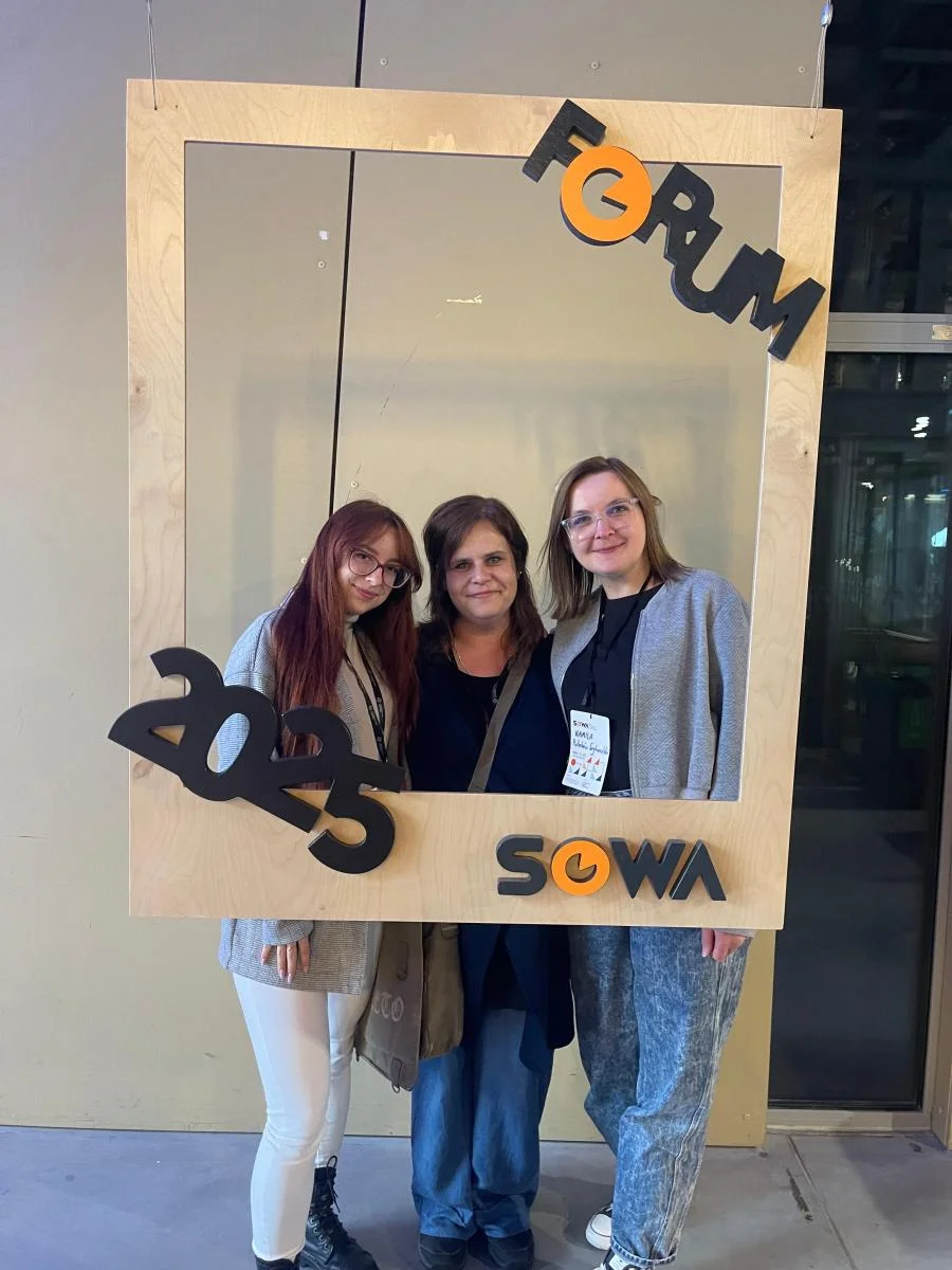 Zdjęcie przedstawia trzy kobiety. Dwie stojące z zewnątrz mają okulary. Osoba stojąca z lewej ma włosy w kolorze czerwonym. Po środku stoi szatynka, a z prawej strony blondynka. Przed osobami znajduje się zawieszona drewniana ramka. W górnym prawym rogu jest skośny napis Forum. W lewym dolnym rogu znajduje się rok 2025. W prawym dolnym rogu ramki jest napis SOWA. W tle widać pastelową ścianę oraz przeszkloną przestrzeń. Mogą to być drzwi. Zdjęcie zrobione zostało w Centrum Nauki Kopernik. Zdjęcie własnością MBP.