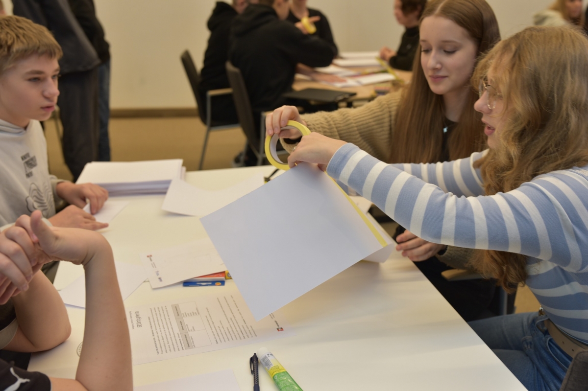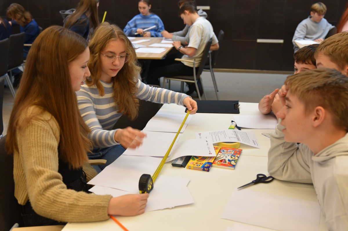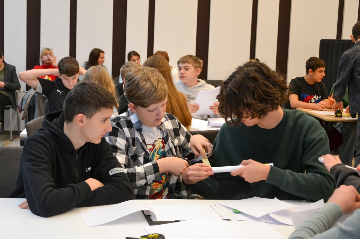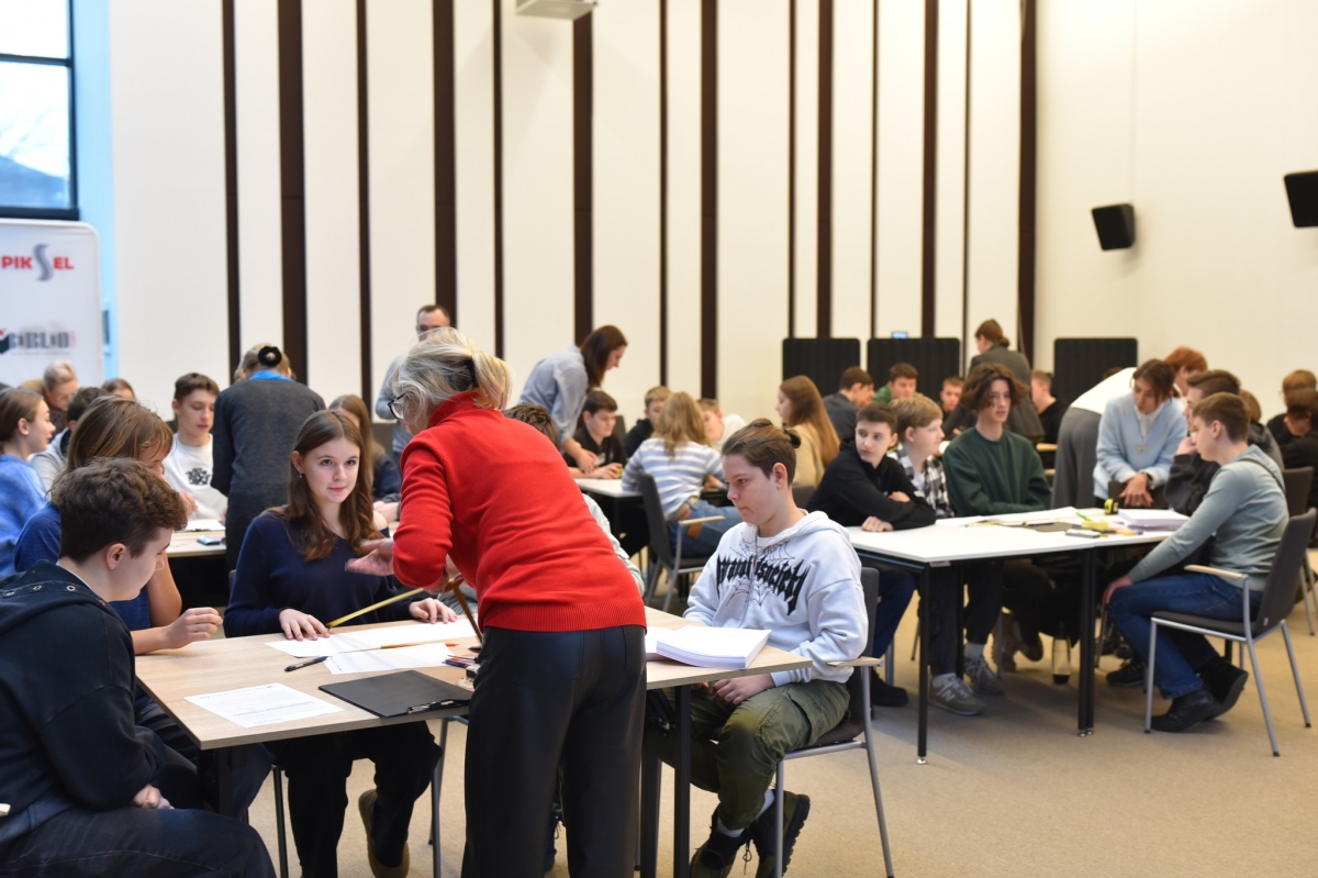 Grupa uczniów bierze udział w drużynowym konkursie matematycznym „GEOinżynieria”. Na pierwszym planie widać kilku uczestników, którzy wspólnie wykonują zadanie, używając linijki i papieru. Każdy z nich angażuje się w pracę zespołową, aby znaleźć najlepsze rozwiązanie. W tle widoczni są inni uczestnicy konkursu oraz nauczyciele i opiekunowie obserwujący wydarzenie. Sala jest wypełniona atmosferą współpracy i skupienia.