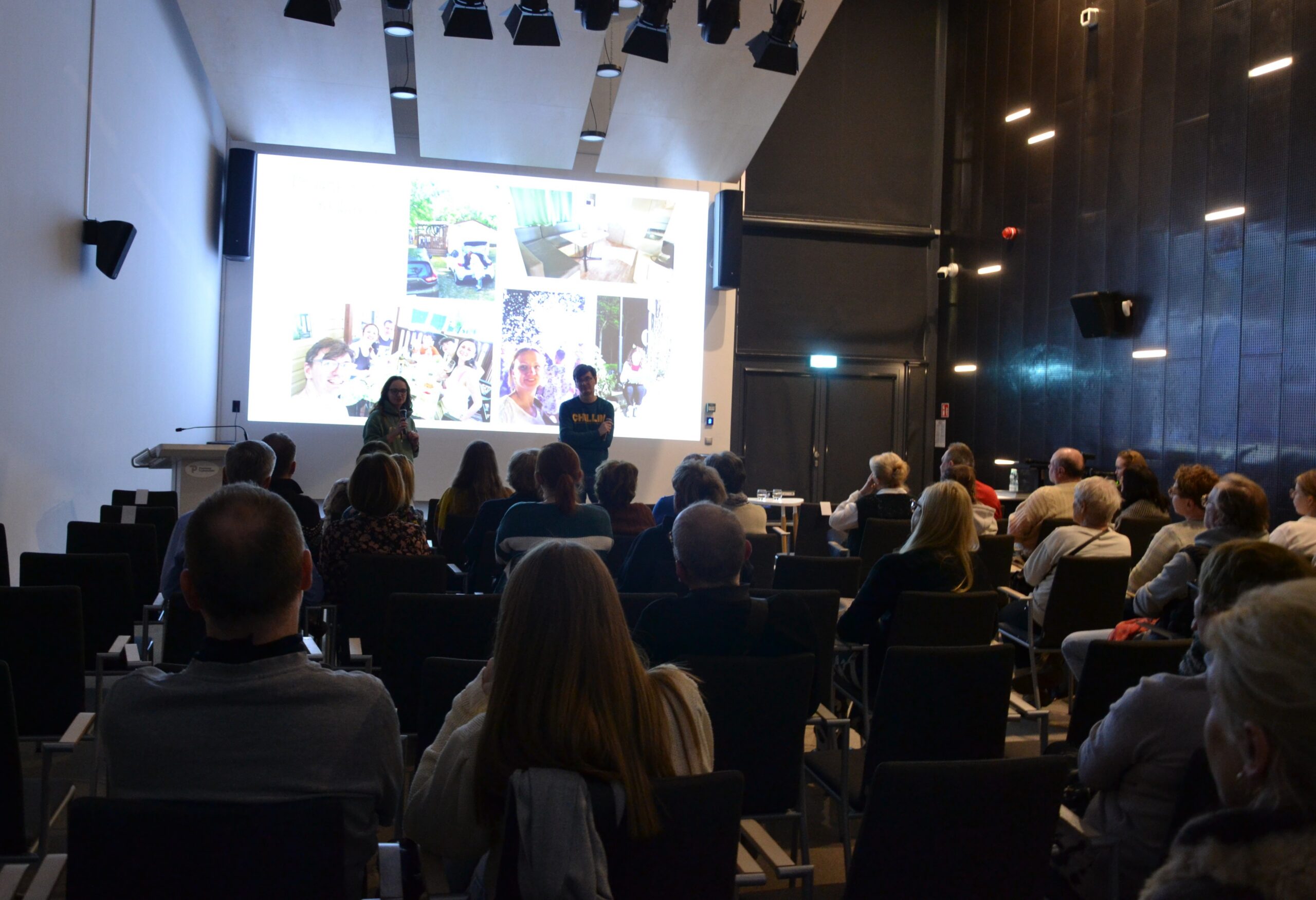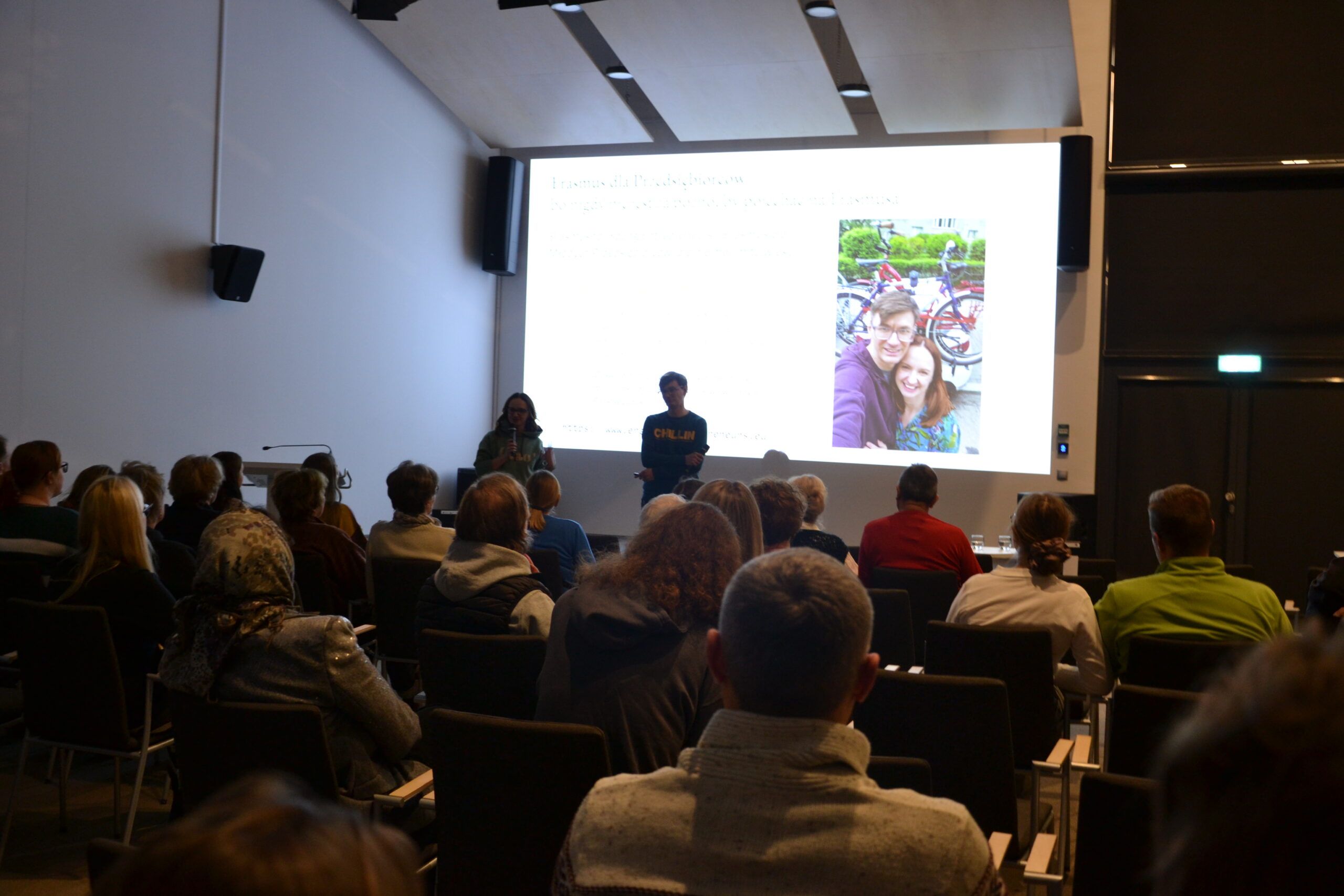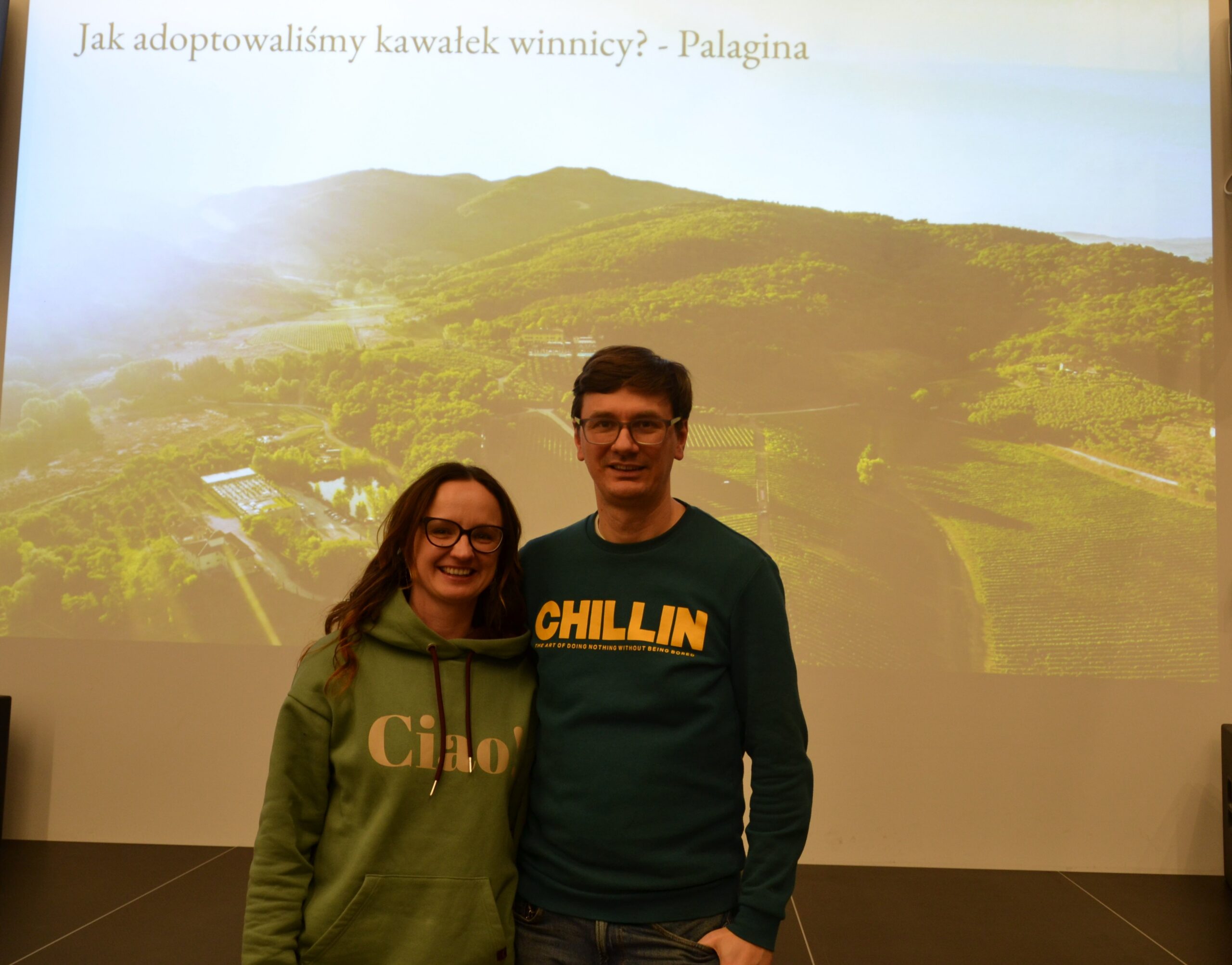 Karolina Iskierka i Paweł Sierszeń stoją przed dużym ekranem projekcyjnym z wyświetlonym slajdem przedstawiającym krajobraz z winnicą. Oboje uśmiechają się do aparatu. Za nimi widoczny jest tytuł prezentacji „Jak adoptowaliśmy kawałek winnicy? – Palagina”. Prelegenci pozują do zdjęcia na scenie w