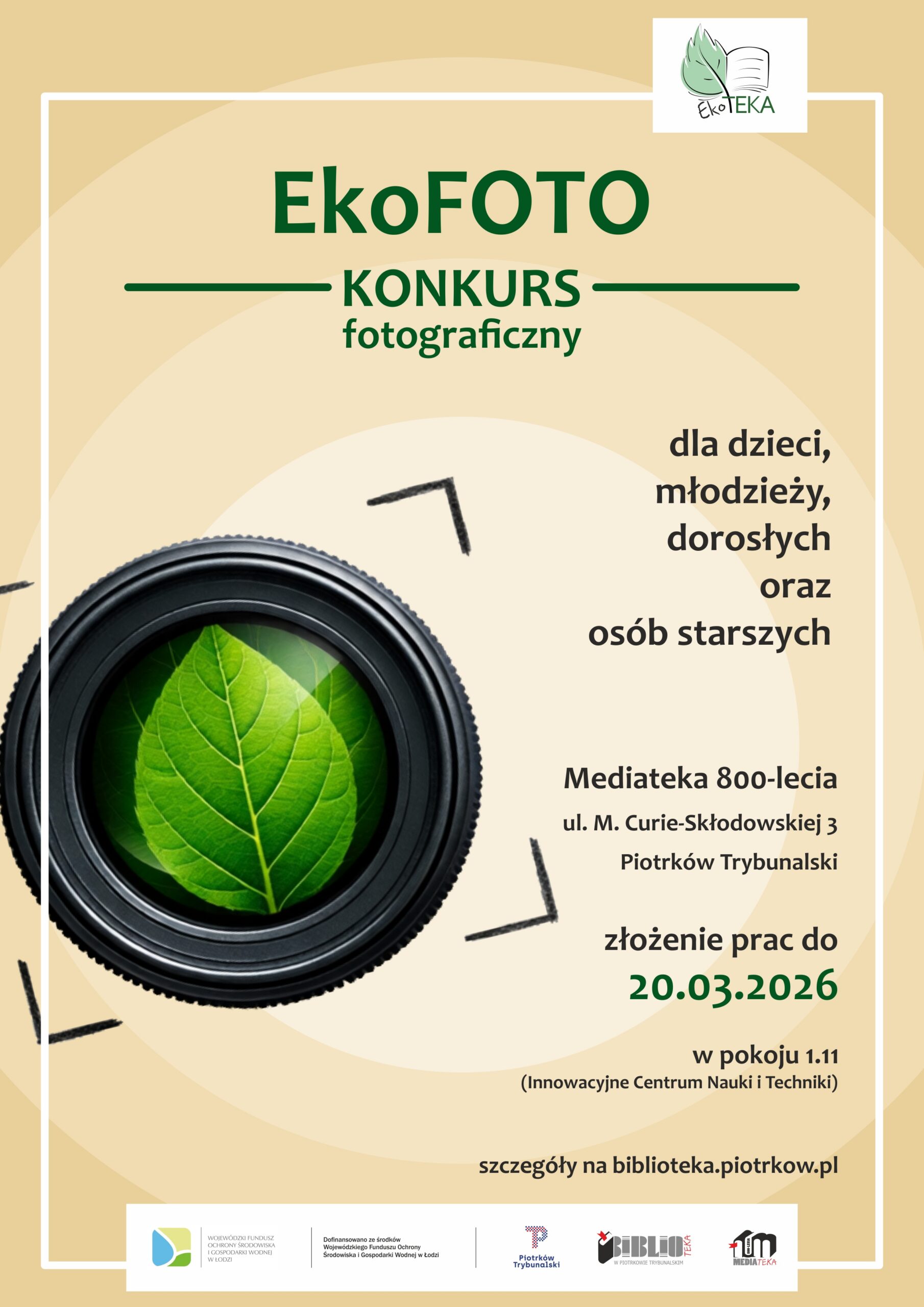 Plakat konkursu fotograficznego „EkoFOTO” skierowanego do dzieci, młodzieży, dorosłych oraz osób starszych, utrzymany w jasnej, ekologicznej kolorystyce. Po lewej stronie widoczny jest obiektyw aparatu fotograficznego, w którego centrum znajduje się zielony liść symbolizujący naturę i ekologię. Na plakacie zamieszczono informacje o miejscu składania prac w Mediatece 800-lecia przy ul. Marii Curie-Skłodowskiej 3 w Piotrkowie Trybunalskim oraz terminie do 20 marca 2026 roku, a także logotypy instytucji partnerskich i organizatorów.