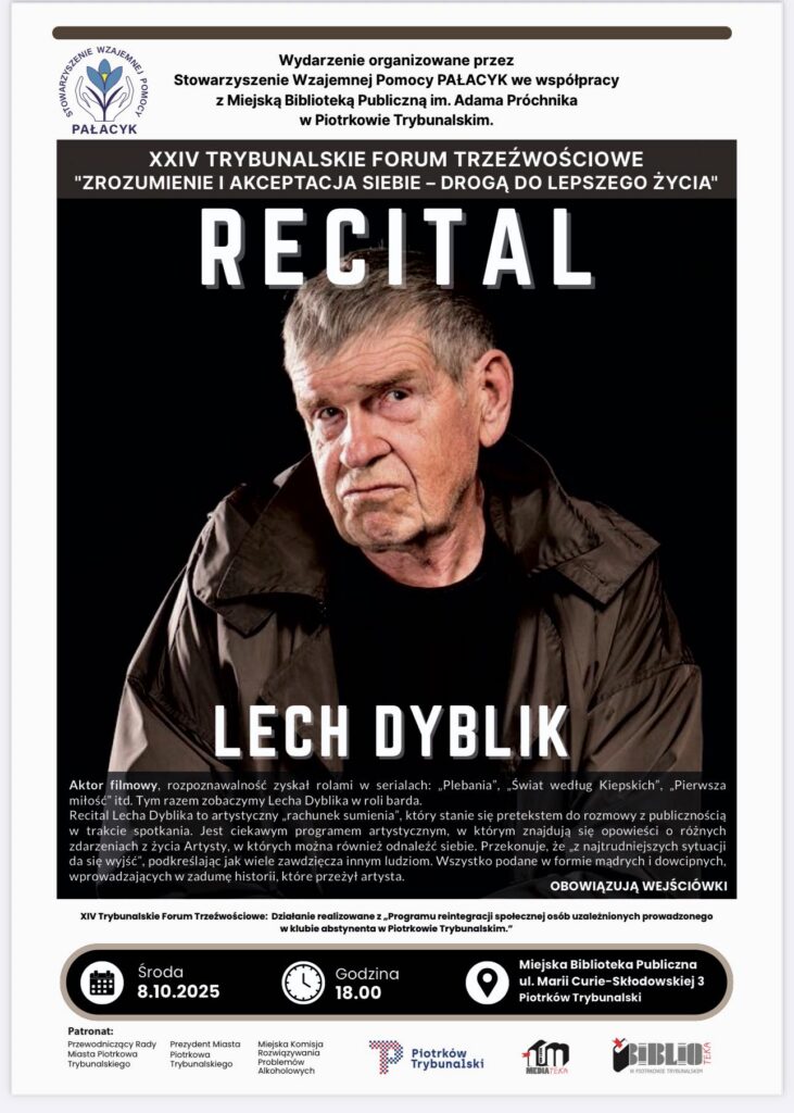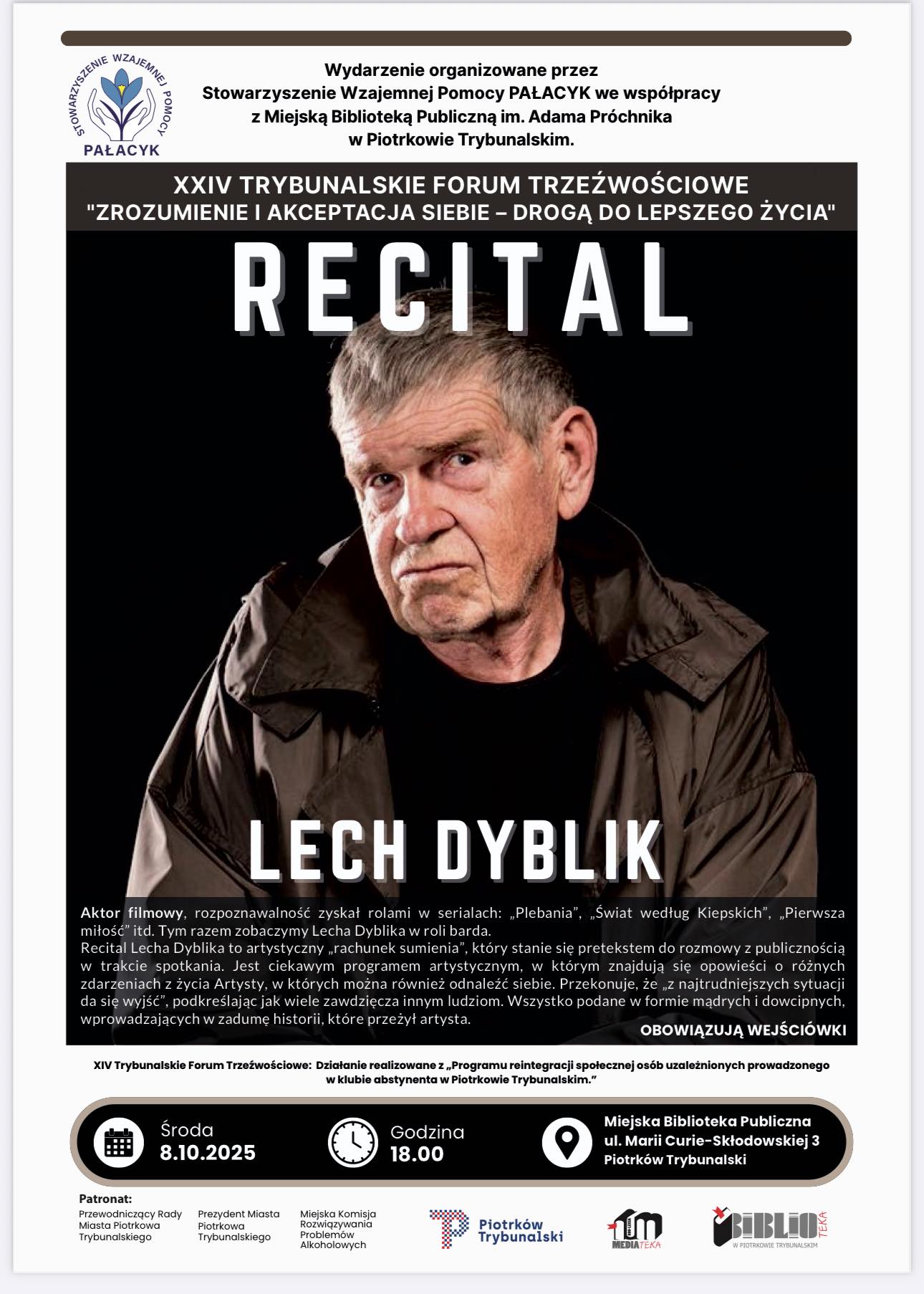 Stowarzyszenie PAŁACYK i Miejska Biblioteka Publiczna w Piotrkowie Trybunalskim zapraszają na spotkanie z aktorem Lechem Dyblikiem.