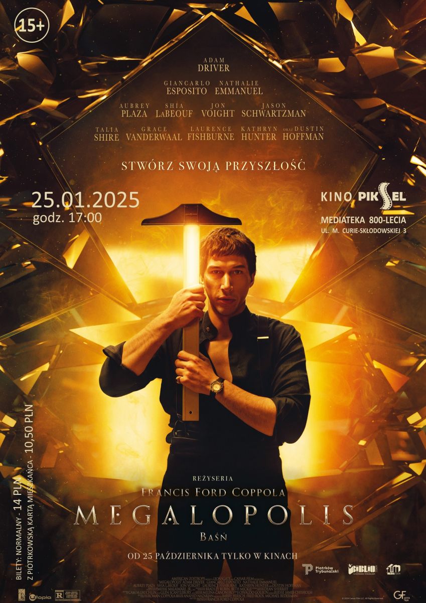 „Megalopolis” to erudycyjny, pełen zaskakujących rozwiązań formalnych i narracyjnych hołd dla niewyczerpanych możliwości kina i absolutnej wolności twórczej – i aby w pełni docenić tę superprodukcję najlepiej obejrzeć ją na jak największym ekranie. W rolach głównych wielkie gwiazdy amerykańskiego kina: Adam Driver, Shia LaBeouf, Aubrey Plaza, Jon Voight, Laurence Fishburne, Jason Schwartzman oraz Dustin Hoffman. (gutekfilm.pl)