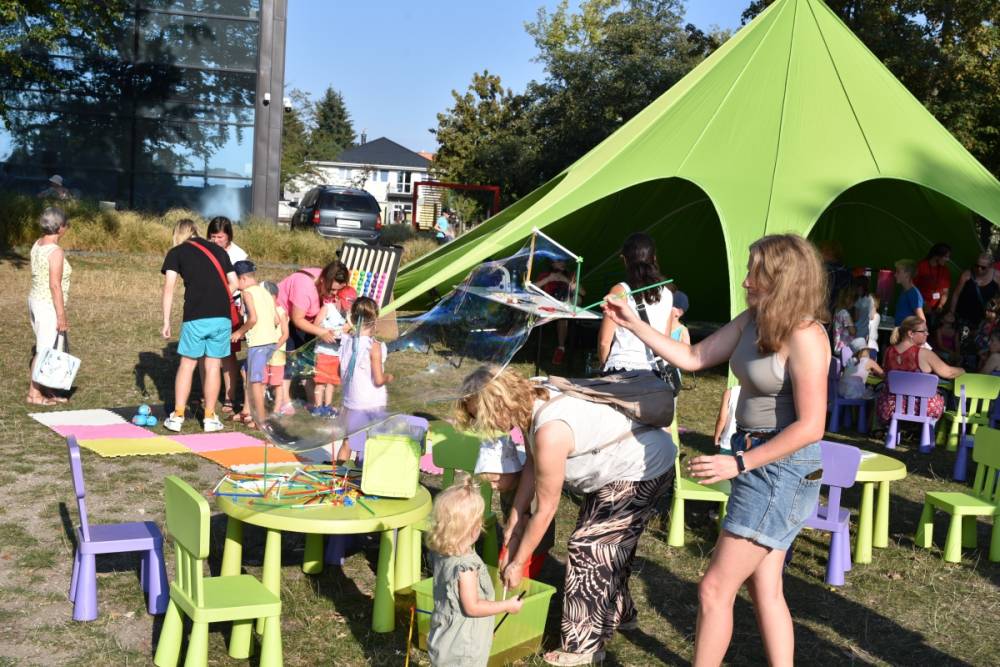 Dzieci i dorośli bawią się na trawie przy dużej dmuchanej zjeżdżalni w kolorach niebieskim, czerwonym i żółtym. Kilkoro dzieci znajduje się na górze i zjeżdża, inne stoją na dole lub czekają na swoją kolej. Wśród uczestników jedna z osób tworzy duże bańki mydlane, które unoszą się w powietrzu i przyciągają uwagę dzieci. Wokół zgromadzone są rodziny obserwujące zabawę, a całość odbywa się w słonecznej, plenerowej atmosferze.dmuchana konstrukcja, na której bawią się dzieci. Atmosfera jest pełna życia, a ludzie cieszą się słoneczną pogodą na zielonej, otwartej przestrzeni