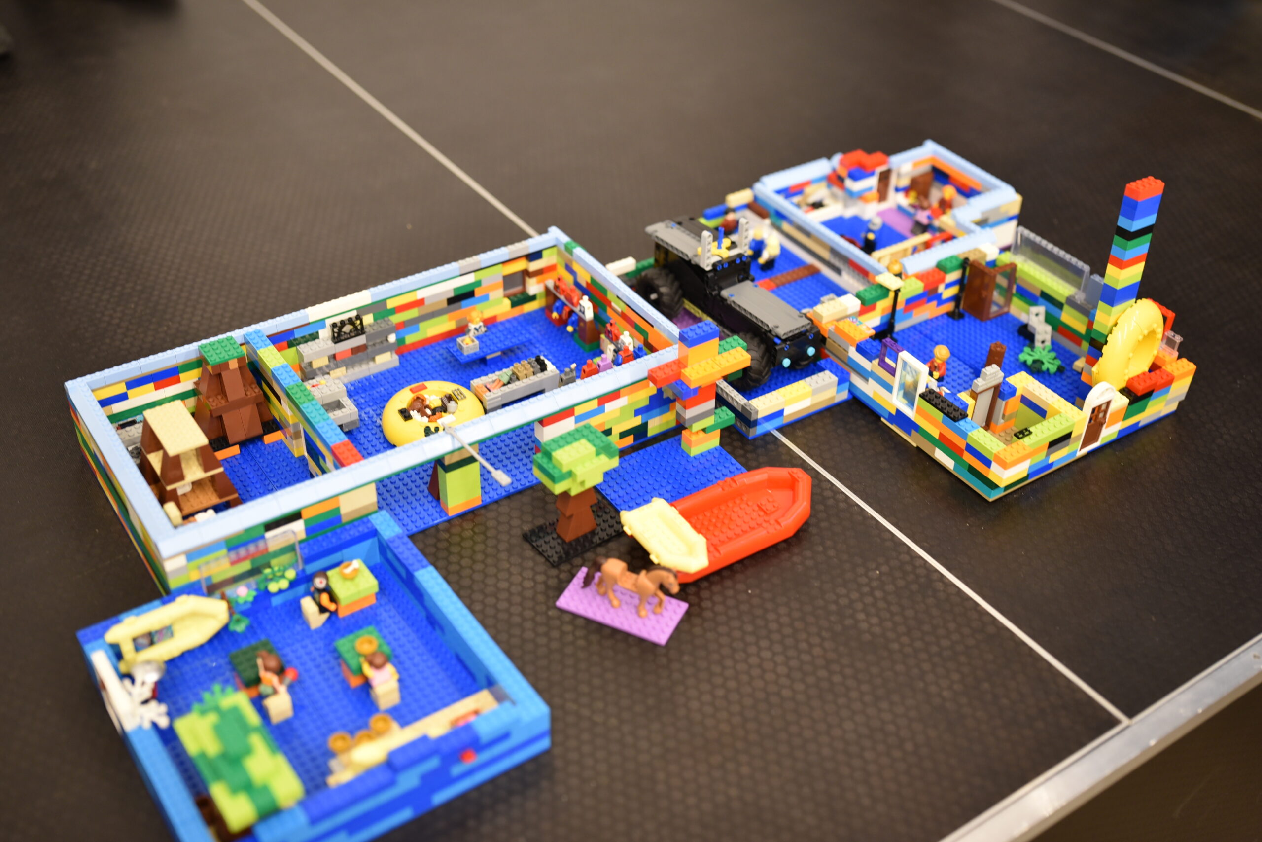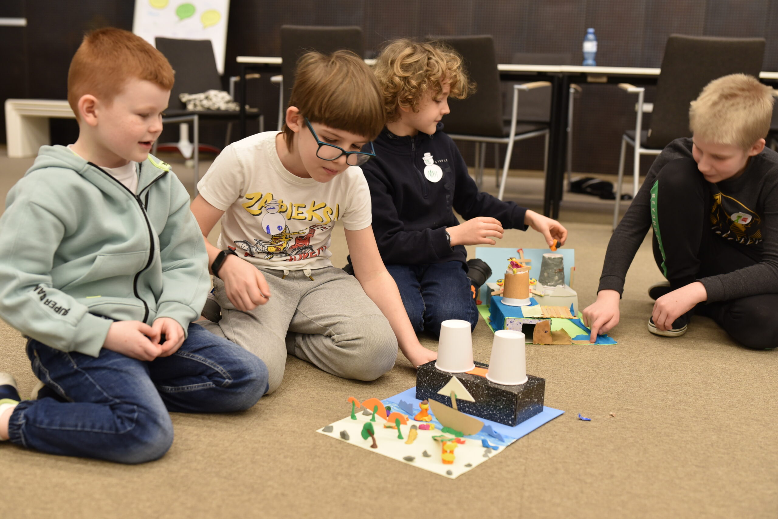 Grupa dzieci siedzi i bawi się wewnątrz dużej konstrukcji z klocków Mammutico w kolorach żółtym i szarym, przypominającej bazę kosmiczną z przejściami. Uczestnicy uśmiechają się, pozują do zdjęcia i unoszą ręce, wyraźnie dumni ze wspólnie stworzonej konstrukcji. W tle widoczna jest sala Mediateki z krzesłami, a cała scena oddaje radosną, integracyjną atmosferę kreatywnej zabawy i współpracy podczas zajęć.