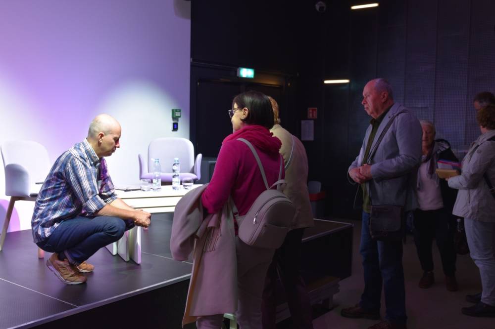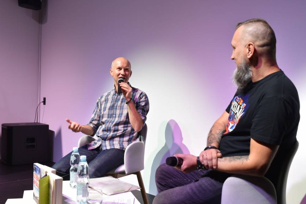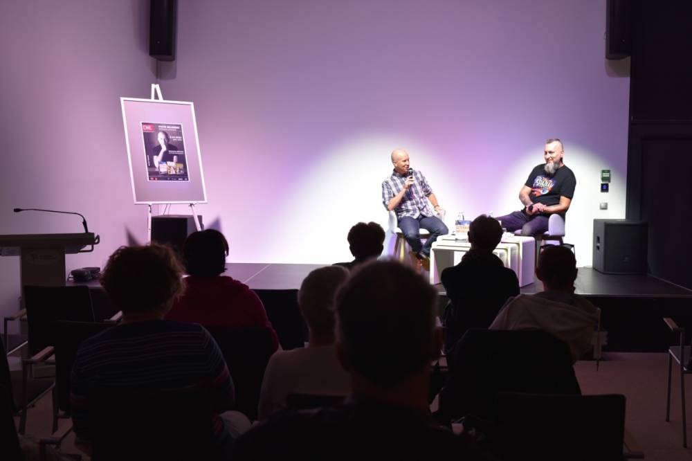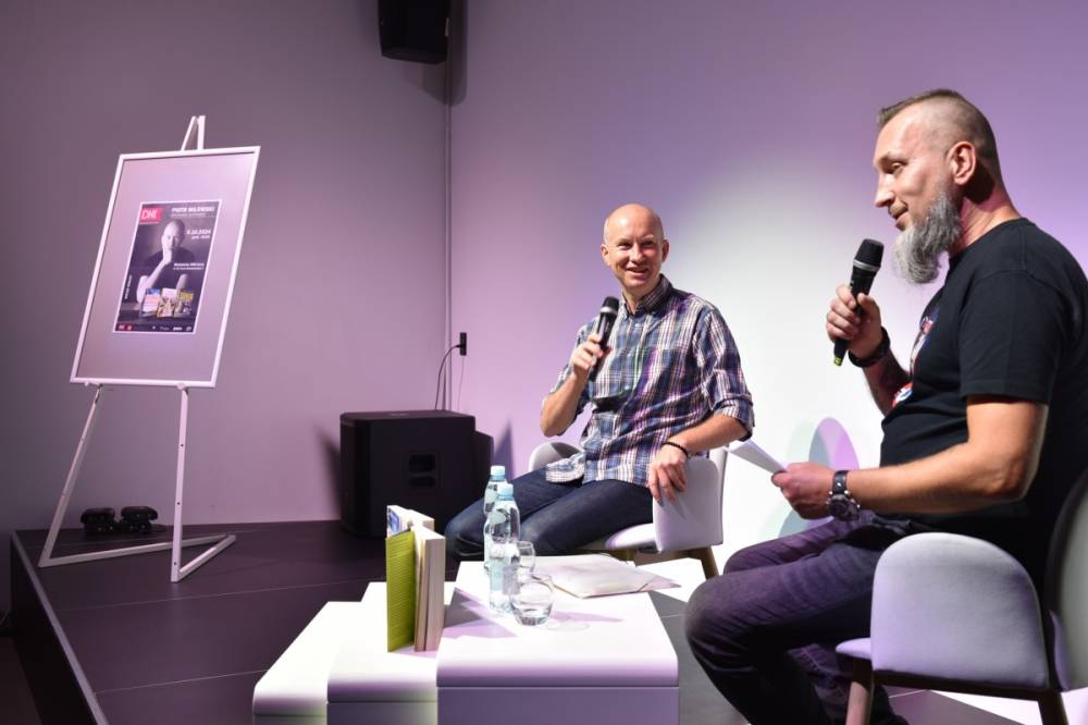 Na zdjęciu rozmowa Piotra Milewskiego z prowadzącym spotkanie.