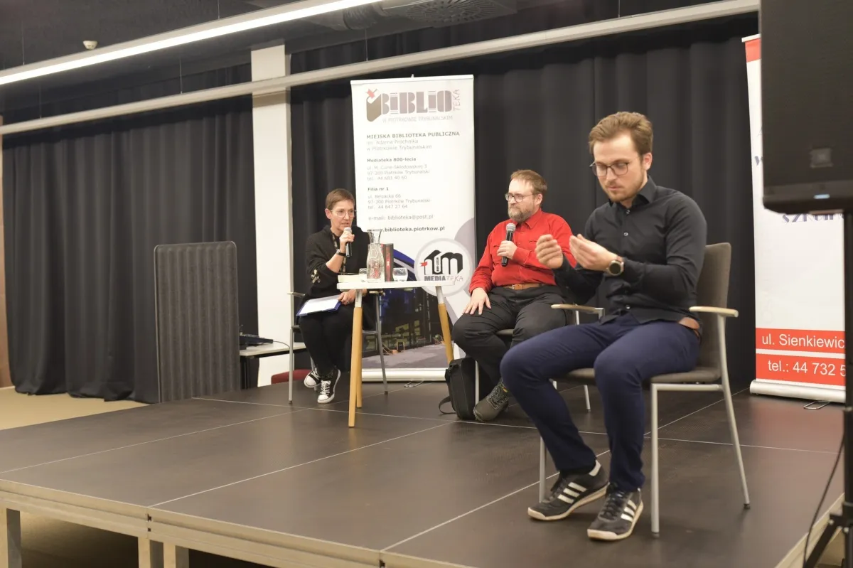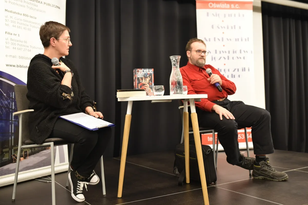 Andrzej Pilipiuk siedzi przy stoliku i trzyma w dłoni mikrofon, odpowiadając na pytania podczas spotkania autorskiego. Obok siedzi prowadząca wydarzenie, która uśmiecha się i również trzyma mikrofon. Na stoliku stoją książki autora, karafka z wodą oraz szklanka. W tle widoczny jest roll-up Miejskiej Biblioteki Publicznej w Piotrkowie Trybunalskim.