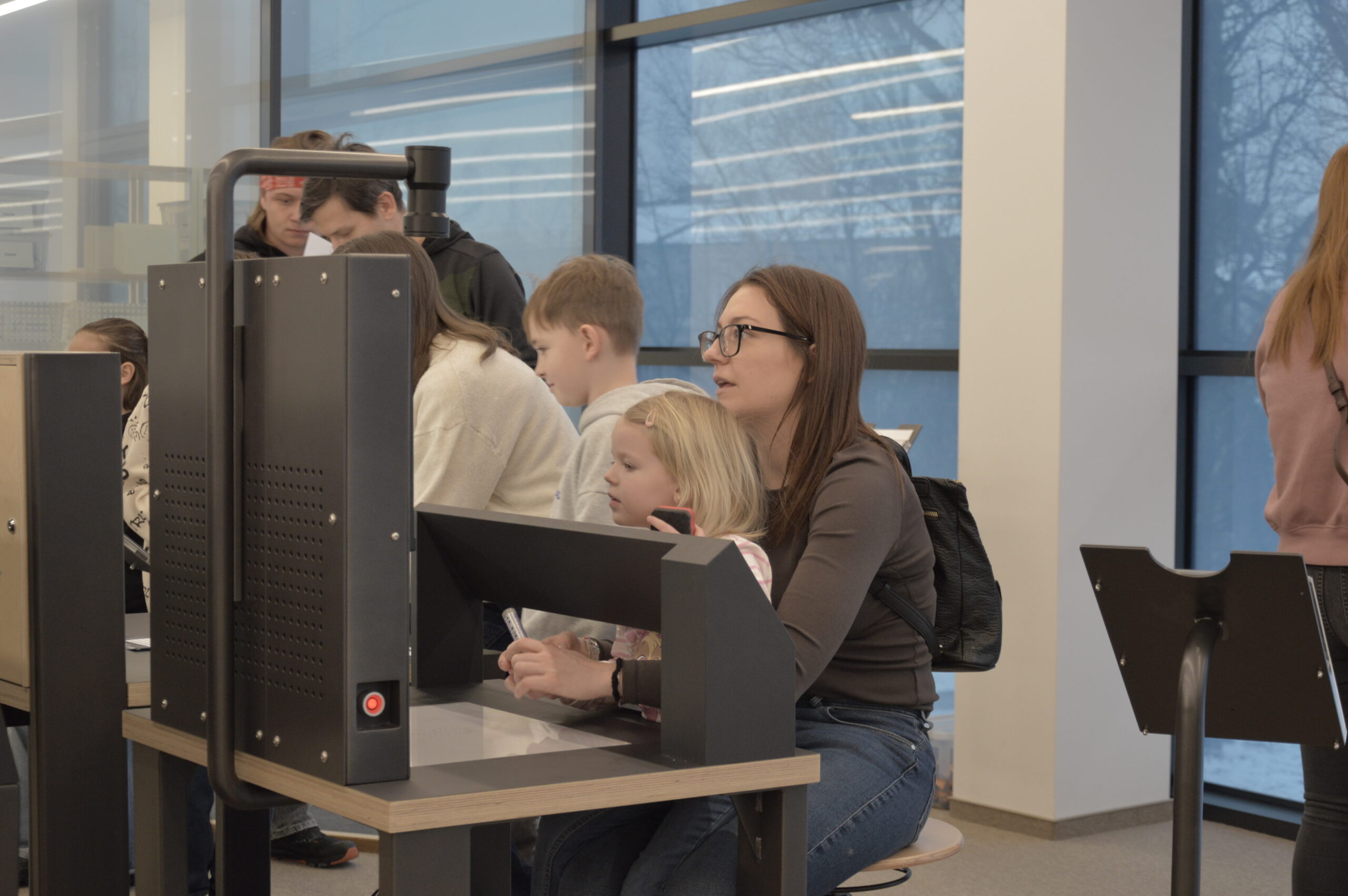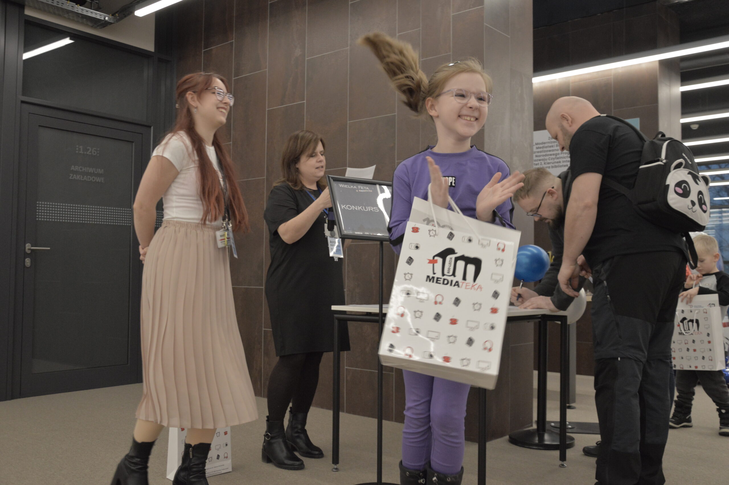 Dziewczynka ubrana w fioletowy strój stoi na pierwszym planie i klaszcze z radością, trzymając w ręku torbę z logo Mediateki. Obok niej stoją pracowniczki biblioteki – jedna z nich uśmiecha się, a druga odczytuje kartkę z wynikami konkursu przy stoliku oznaczonym tabliczką „Konkurs”. Po prawej stronie widać uczestników wydarzenia wypełniających formularze przy stole. Zdjęcie zostało wykonane podczas wydarzenia „Wielka Feta u Kopernika”, w trakcie ogłoszenia wyników konkursu dla uczestników wydarzenia.