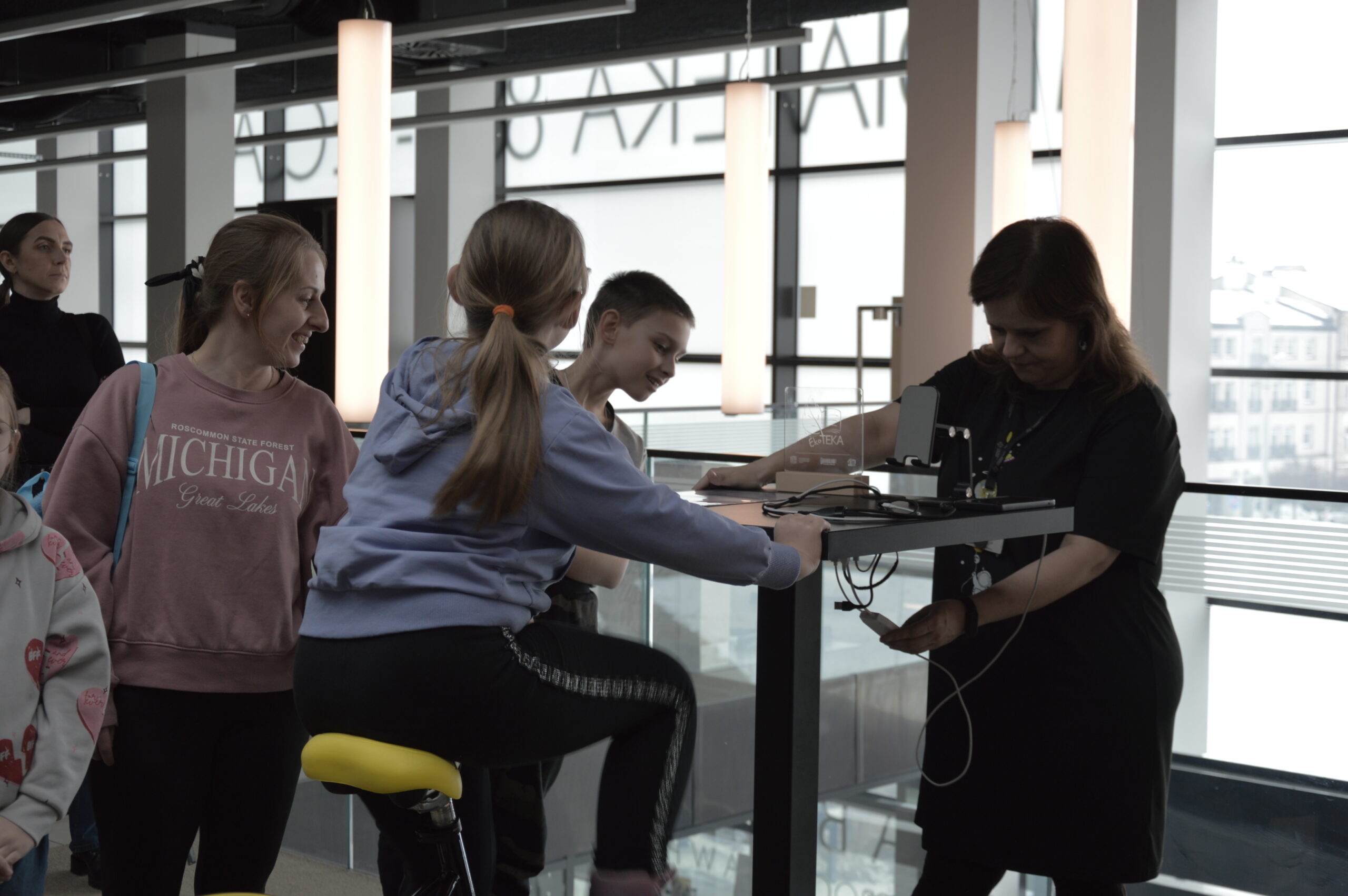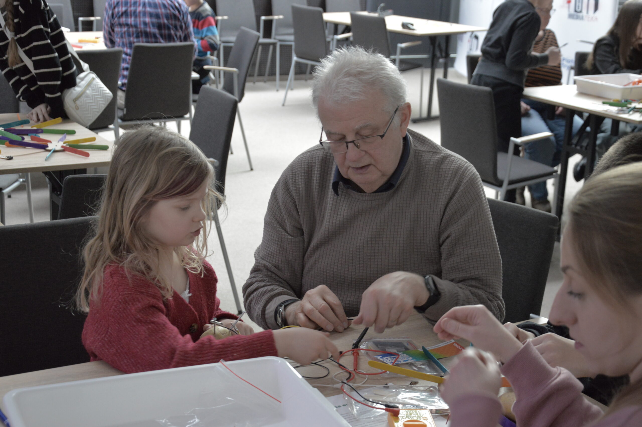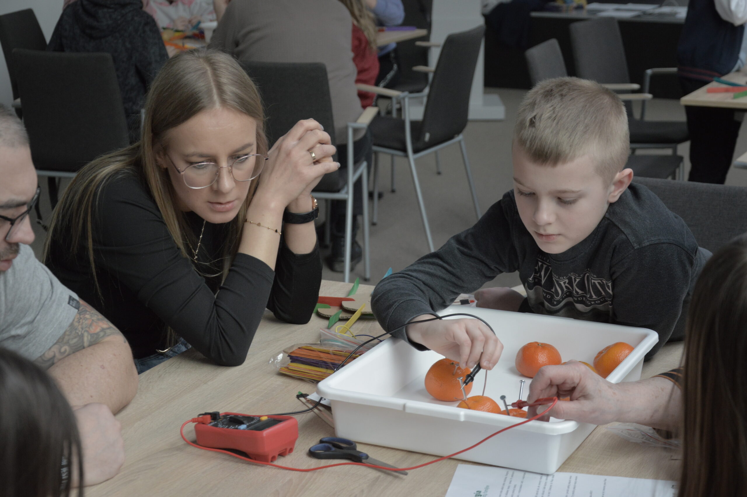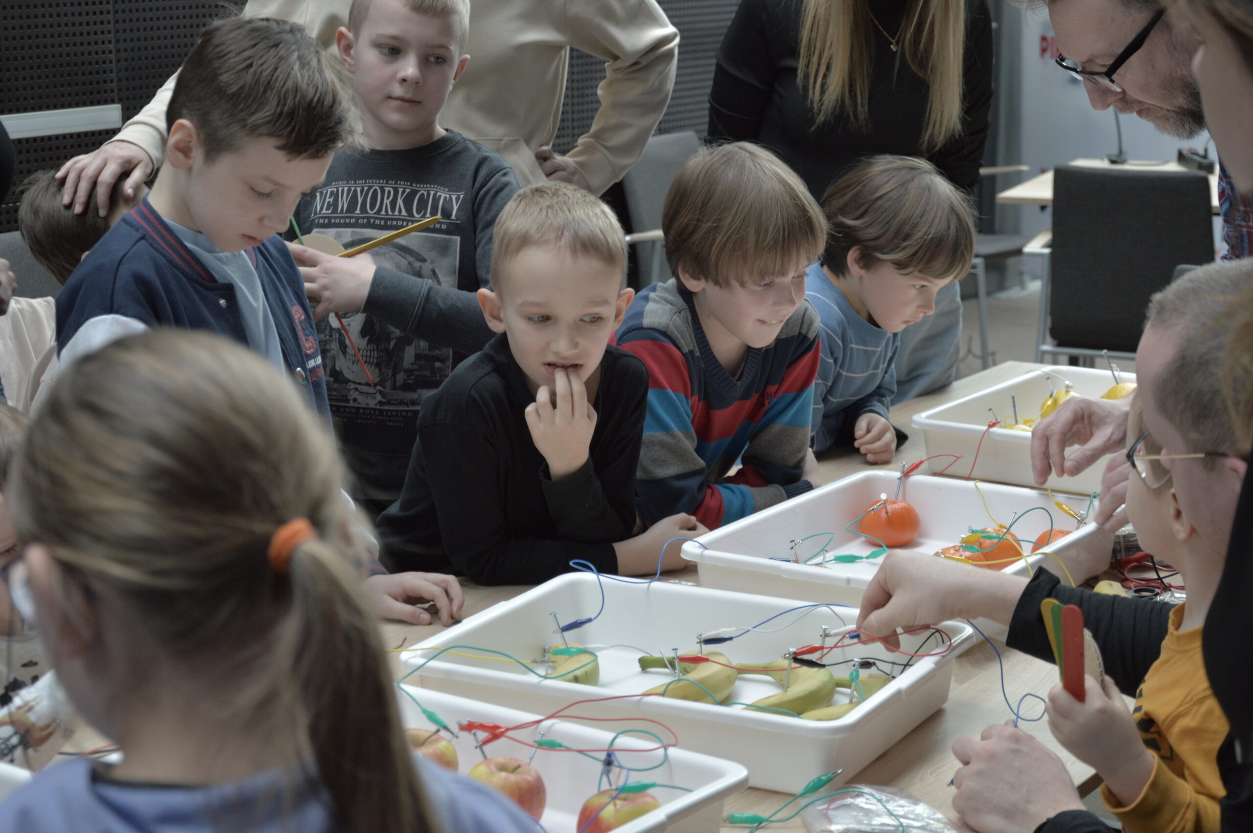 Grupa dzieci wraz z opiekunami uczestniczy w warsztatach edukacyjnych przy wspólnym stole. Uczestnicy z dużym skupieniem obserwują eksperyment polegający na tworzeniu prostych układów elektrycznych z wykorzystaniem owoców, takich jak jabłka, cytryny, banany i mandarynki, do których podłączone są przewody i elektrody. Prowadzący wyjaśnia zasady działania obwodu, a dzieci śledzą wskazania podłączonych elementów, ucząc się w praktyce, w jaki sposób można wytwarzać energię.