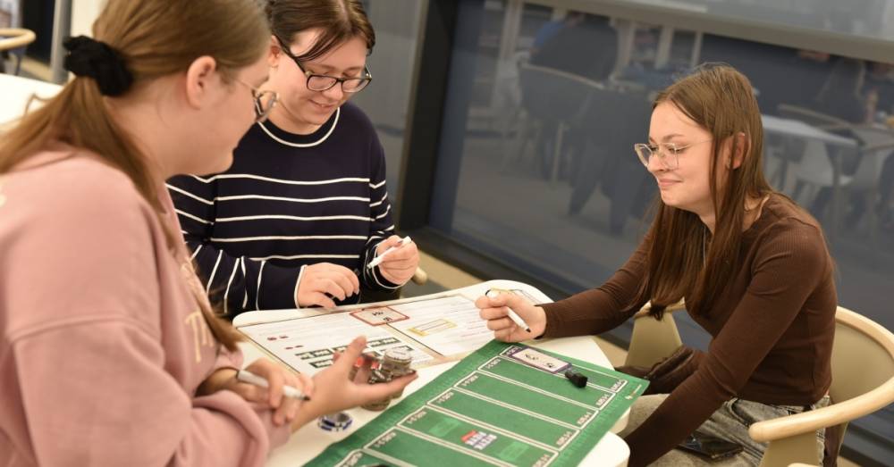 Na zdjęciu widać grupę osób grających w gry planszowe w przytulnej przestrzeni. Na pierwszym planie trzy osoby – dwie dziewczynki i młoda kobieta – grają w Monopoly. Jedna z dziewczynek stoi, trzyma kartę i wydaje się czytać jej treść, podczas gdy dwie pozostałe uczestniczki analizują sytuację na planszy. Na stole leżą pieniądze z gry, karty oraz różne napoje. Obok stoi kula ortopedyczna. W tle inne osoby również grają w gry planszowe, a na półkach za nimi widać różnorodne pudełka z planszówkami. Atmosfera jest swobodna i sprzyja wspólnemu spędzaniu czasu.