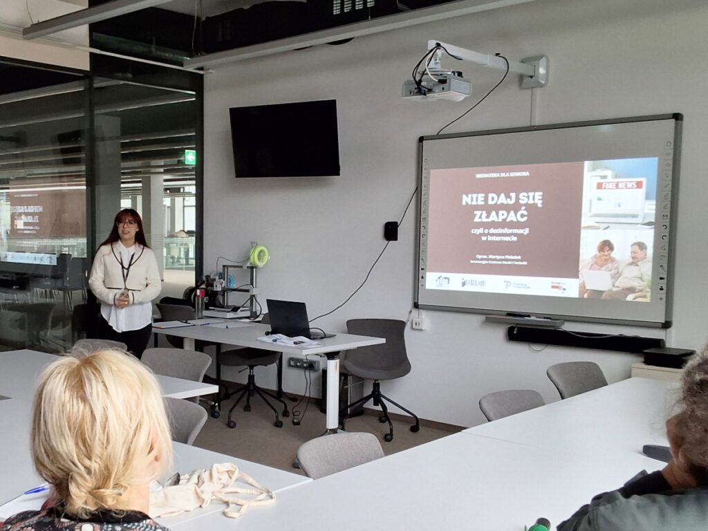 19 września odbyły się zajęcia z cyklu Mediateka dla seniora. Podczas warsztatów „Nie daj się złapać, czyli o dezinformacji w Internecie” seniorzy mieli możliwość dowiedzieć się, jak rozpoznawać fałszywe informacje, a także czym jest generatywna sztuczna inteligencja i jak rozróżniać treści wygenerowane przez nią. Nie zabrakło też praktycznego wykorzystania wiedzy podczas rozwiązywania tematycznych quizów.