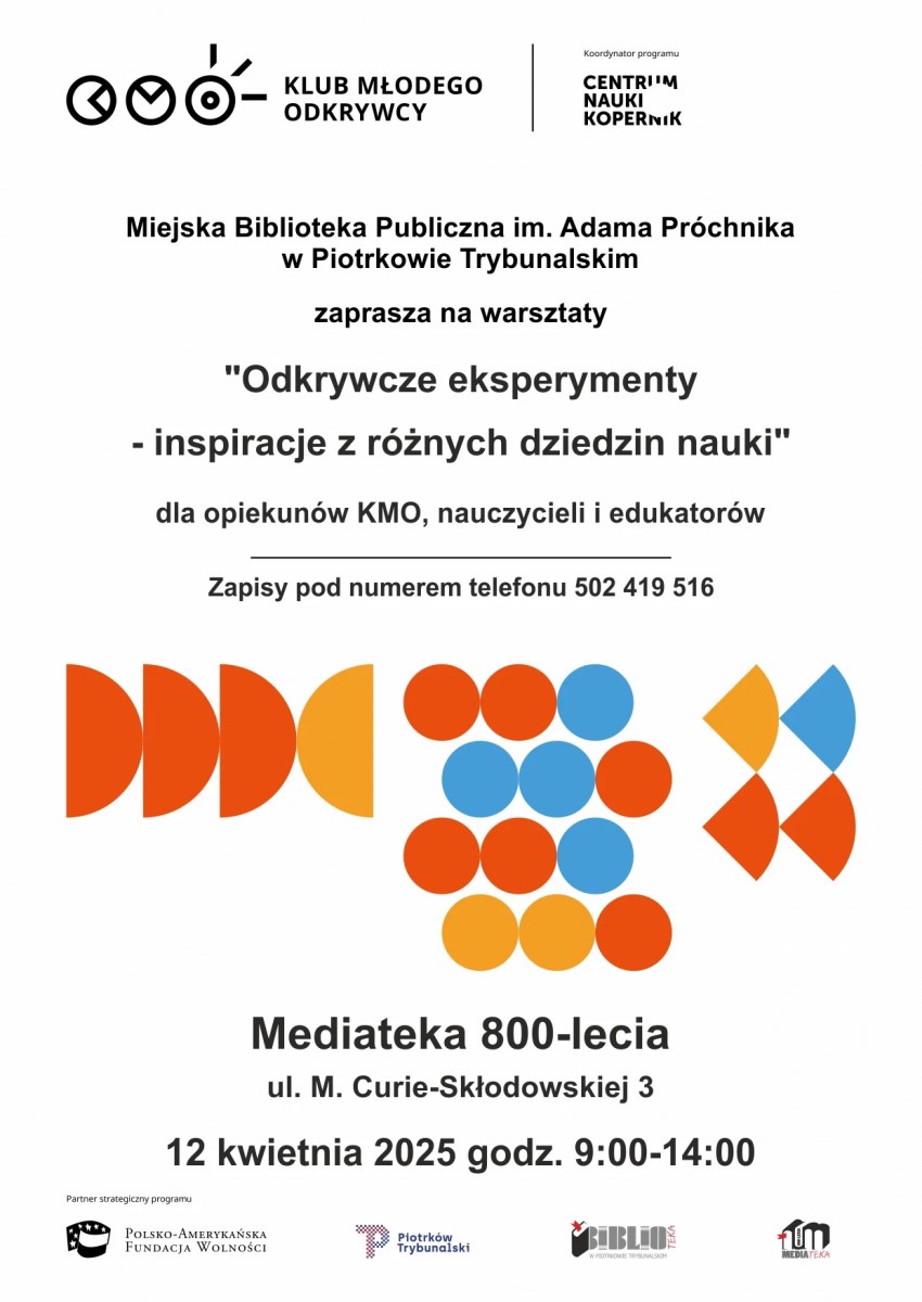 Miejska Biblioteka Publiczna im. Adama Próchnika w Piotrkowie Trybunalskim, regionalny partner programu Klub Młodego Odkrywcy, zaprasza na warsztaty pn. „Odkrywcze eksperymenty – inspiracje z różnych dziedzin nauki”. Podczas zajęć uczestnicy dowiedzą się, jak wykorzystać interdyscyplinarne podejście w nauczaniu i tworzyć angażujące projekty, które rozbudzą pasję do nauki.