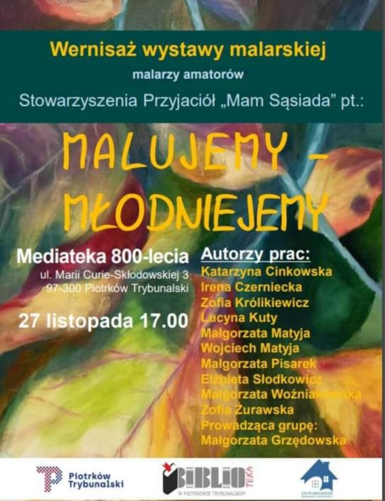 Zapraszamy na wystawę „Malujemy – młodniejemy”, gdzie swoje prace zaprezentuje dziesięcioro malarzy amatorów związanych ze Stowarzyszeniem Przyjaciół „Mam Sąsiada” od października 2021 roku. Twórcami są głównie emeryci, którzy postanowili rozwijać swoje ukryte pasje artystyczne, eksperymentując z ołówkiem, kolorem i pędzlem. Ich obrazy olejne o różnorodnej tematyce powstawały na przestrzeni trzech lat, stanowiąc świadectwo zaangażowania i radości z tworzenia w gronie osób o podobnych zainteresowaniach.