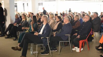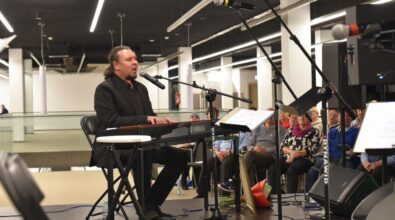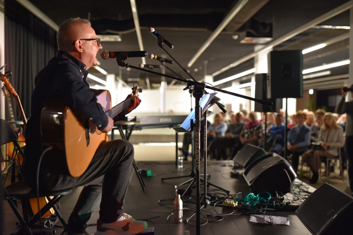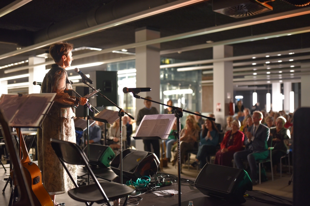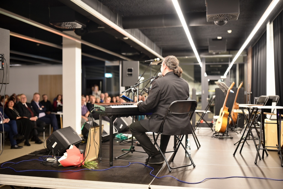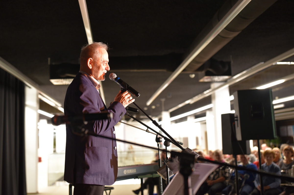 Na zdjęciu widoczny jest mężczyzna stojący na scenie i przemawiający do mikrofonu. Ubrany jest w elegancką marynarkę, a jego sylwetka oświetlona jest światłem scenicznym, które podkreśla profil twarzy. Przed nim znajdują się statywy z mikrofonami oraz pulpit z nutami lub notatkami, a w tle widoczna jest klawiatura oraz elementy nagłośnienia. W głębi kadru można dostrzec siedzącą publiczność, skupioną na wystąpieniu, co wskazuje na oficjalny charakter wydarzenia odbywającego się w nowoczesnej przestrzeni Mediateki.